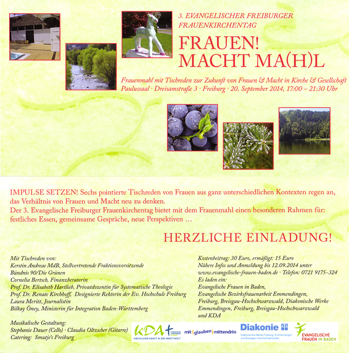 Impulse setzen! Sechs pointierte Tischreden von Frauen aus ganz unterschiedlichen Kontexten regen an, das Verhältnis von Frauen und Macht neu zu überdenken. Der 3. Evangelische Freiburger Frauenkirchentag bietet mit dem Frauenmahl einen besonderen Rahmen für: festliches Essen, gemeinsame Gespräche und neue Perspektiven.