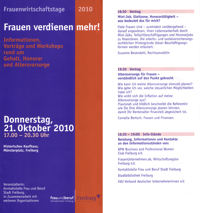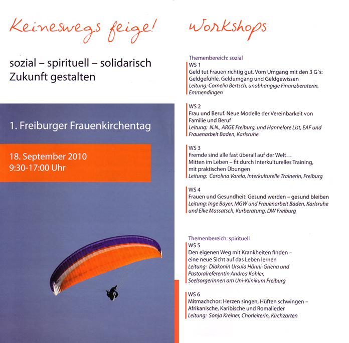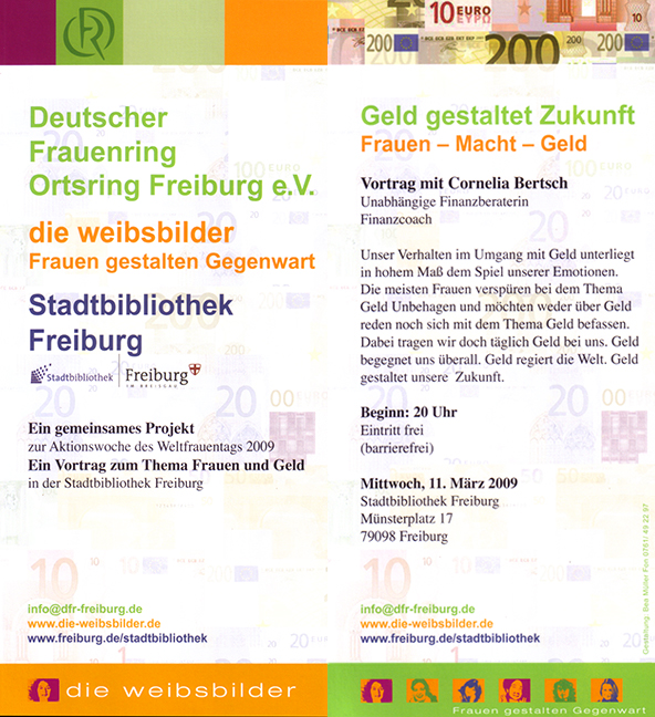 Motto der Veranstaltung: Sozial-spirituell-solidarisch Zukunft gestalten. Frauen unterschiedlichen Alters, Herkunft und Ausbildung miteinander ins Gespräch bringen. Cornelia Bertsch leitet u.a. einen Workshop auf dem 1. Freiburger Frauenkirchentag in Freiburg. Thema: Geld tut Frauen richtig gut. Vom Umgang mit den 3G's: Geldgefühle, Geldumgang und Geldwissen.